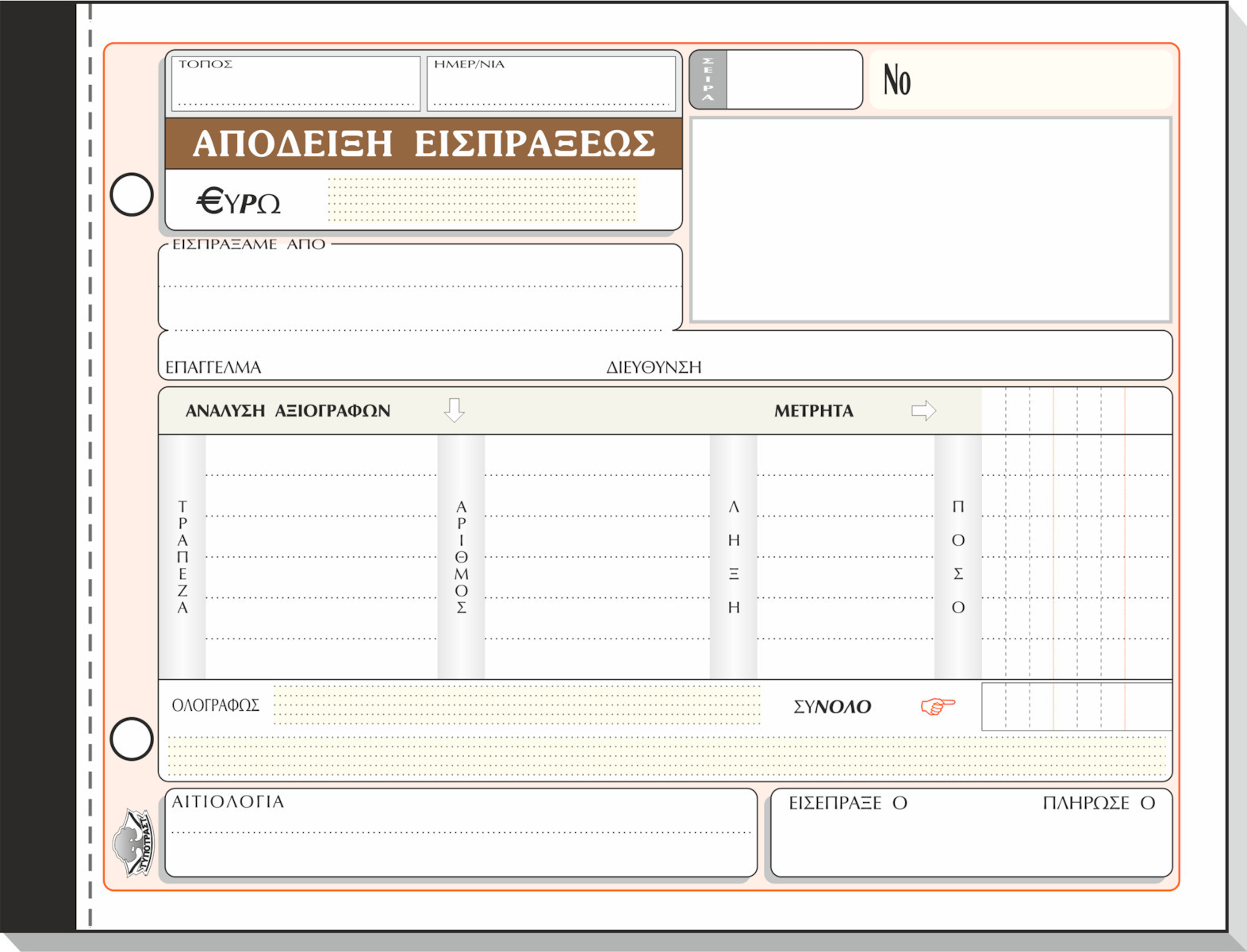 Αποδεικτικό είσπραξης ποσού με ανάλυση για μετρητά ή επιταγές ή αξιόγραφα